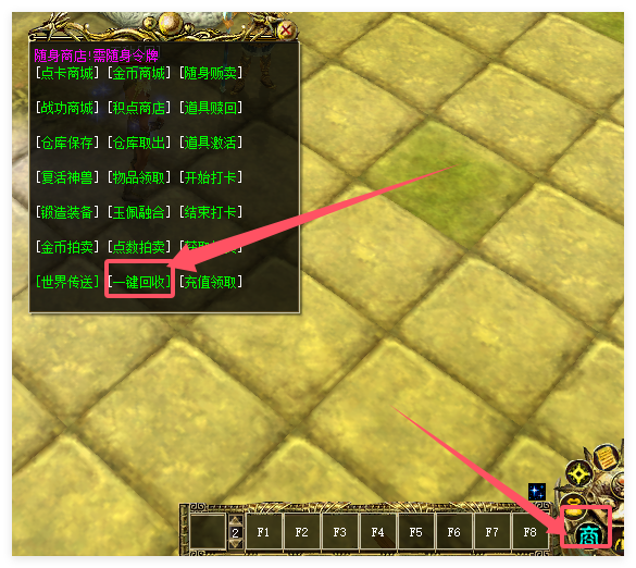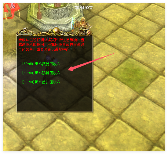 2.回收前 请将需要的金装存进仓库 防止被一键回收
